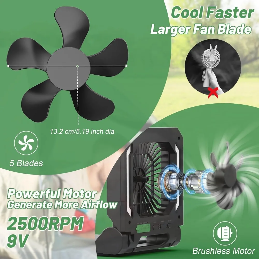 - 【Timer Setting】Cooling Fan, timer setting, and LED light are controlled separately. Our rechargeable handheld fan for tents is equipped with a sleep timer that you can customize to run for 1H, 2H, 3H, or 4H, which saves you the hassle of manually turning the fan on or off. With battery powered fan for camping whisper-quiet brushless motor and a convenient auto-off timer, you can enjoy a peaceful sleep with the lights turned off for added comfort.
