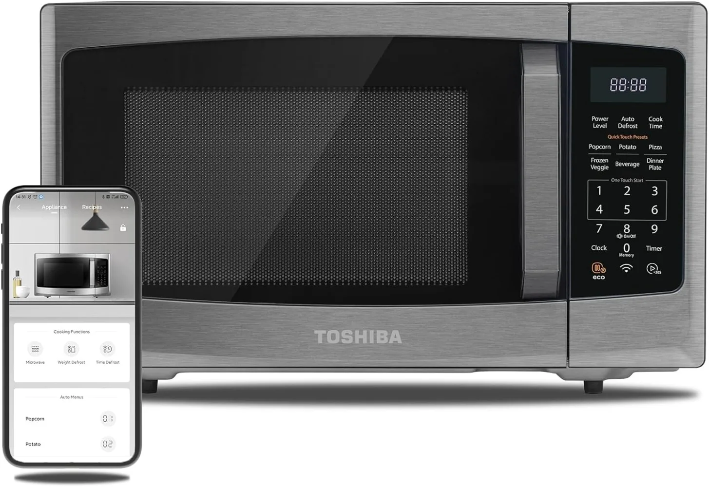 - 【Online Recipes in App】Connect to Toshiba TSmartLife App to discovery popular recipes with clear instructions on each step. The microwave oven will set the time and power automatically.